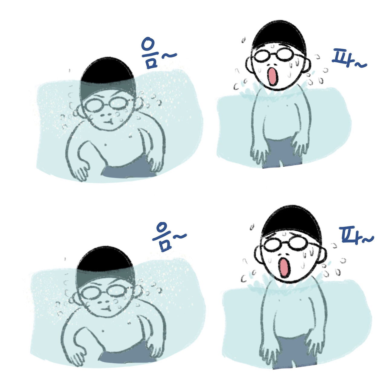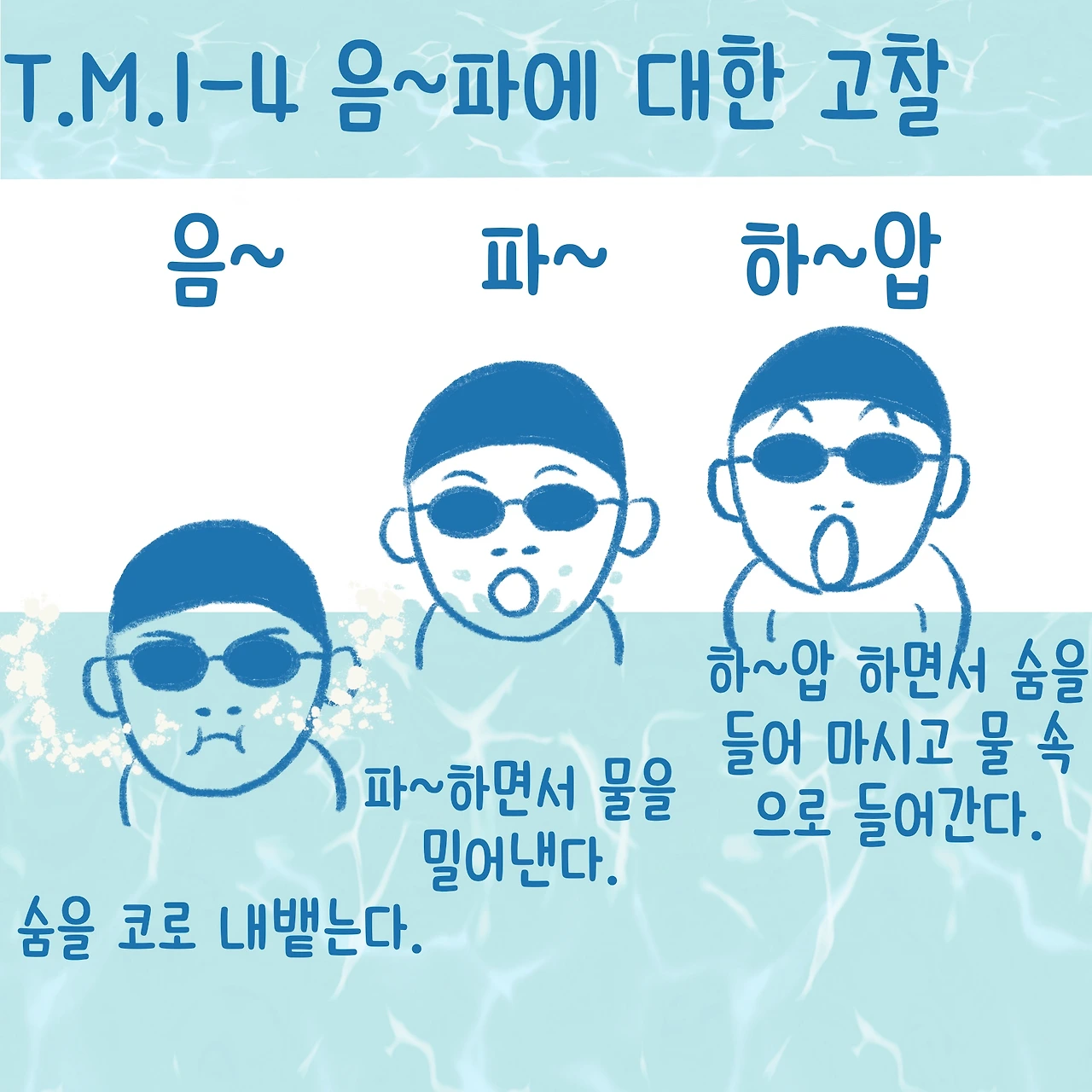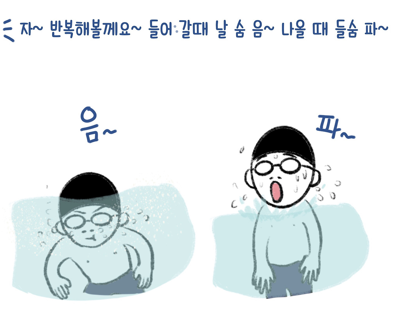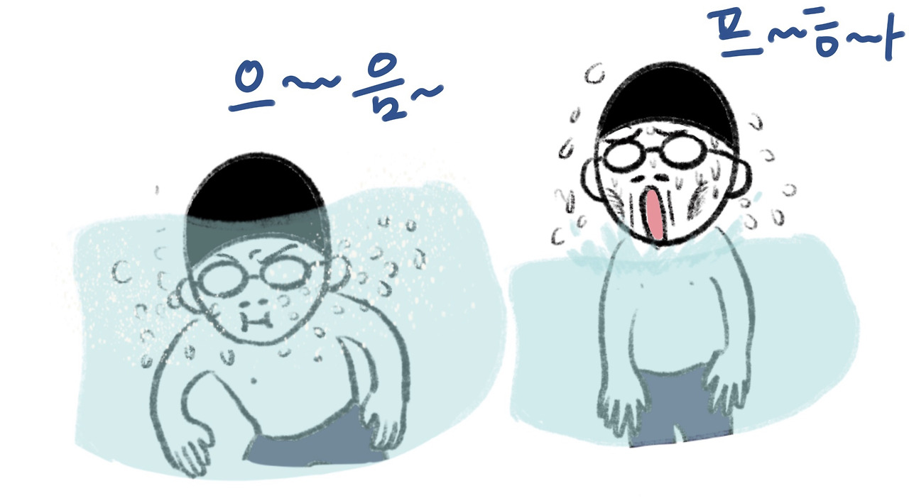 수영의 시작은 물속 호흡법이다. 보통은 음~파~ 로 알고 있는데, 막상 음, 파를 해보면 음은 코로 파는 입으로 하는 날 숨이다. 그러니 음파~ 음파~를 하다 보면 점점 숨이 차는 것이다. ( 강사 샘 왈~;;;;) 정확히 말하면 음~하면서 내뱉고 파~하면서 물을 밀어내고, 하~압 하면서 숨을 들이 마시고 다시 물속으로 들어가는 것이다. 다시 말해 음~파~하압, 음~파~하압 이라고 해도 될 것이다.