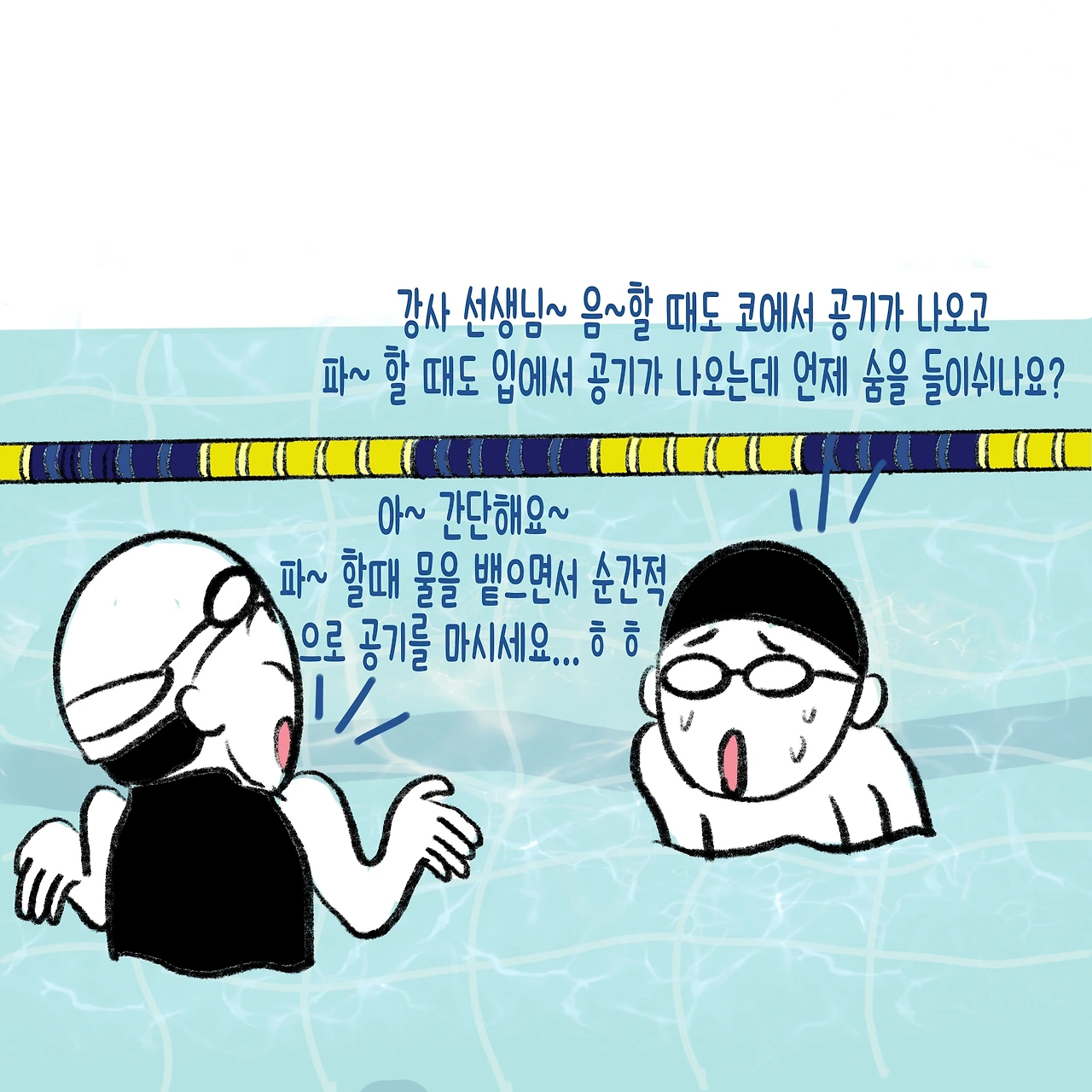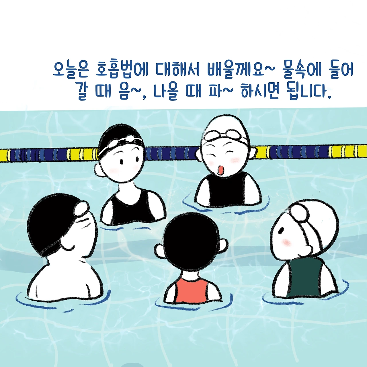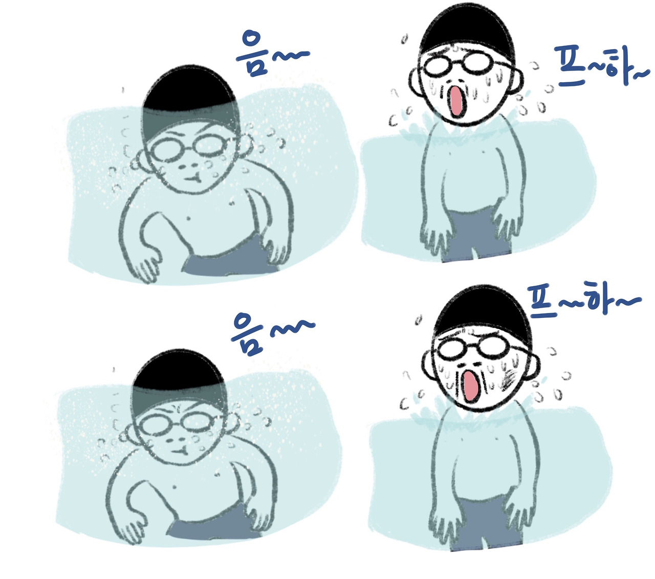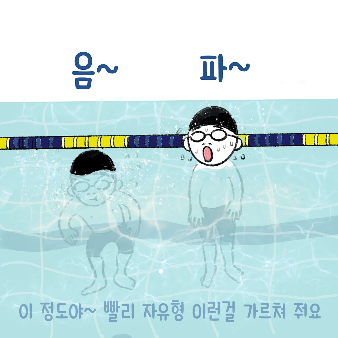 수영의 시작은 물속 호흡법이다. 보통은 음~파~ 로 알고 있는데, 막상 음, 파를 해보면 음은 코로 파는 입으로 하는 날 숨이다. 그러니 음파~ 음파~를 하다 보면 점점 숨이 차는 것이다. ( 강사 샘 왈~;;;;) 정확히 말하면 음~하면서 내뱉고 파~하면서 물을 밀어내고, 하~압 하면서 숨을 들이 마시고 다시 물속으로 들어가는 것이다. 다시 말해 음~파~하압, 음~파~하압 이라고 해도 될 것이다.