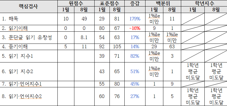 위 결과를 보면 읽기 이해와 관련된 검사 결과의 원점수는 변화가 없고 표준 점수는 감소한 것을 볼 수 있다. 이는 사전 검사 시기가 1월이고 사후검사 시기가 8월 이기 때문에 각 시기에 해당되는 학생들의 평균 중 검사자의 위치를 나타내는 표준점수는 하락한 것으로 해석된다. 그 외 나머지 읽기 지수의 상승은 관찰 기록 속 변화의 모습에 신뢰도를 높여주는 근거자료라고 볼 수 있었다. 또한 전체적으로 보면 아직도 1학년 평균에 미도달 되어 갈 길이 멀어 보이지만 3개월간의 지속적 교육은 효과가 있었고 교육시간을 늘리고 지속한다면 발달적 문해력의 결손을 어느 정도 극복하여 아이들의 정상적인 수업 참여의 가능성이 높아지고 지속적인 학습결손을 어느 정도 막을 수 있지 않을까?라는 생각이 들었다.