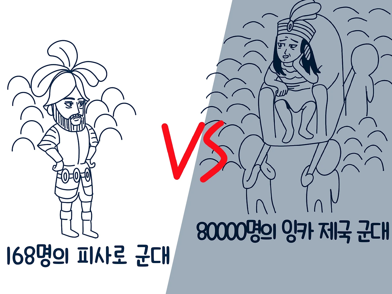 몇 시간이 지나지 않아서 수천 명의 잉카 사람들이 죽고 잉카의 왕인 아타우알파가 생포되면서 잉카제국이 168명 앞에 무릎을 꿇게 된 거지.