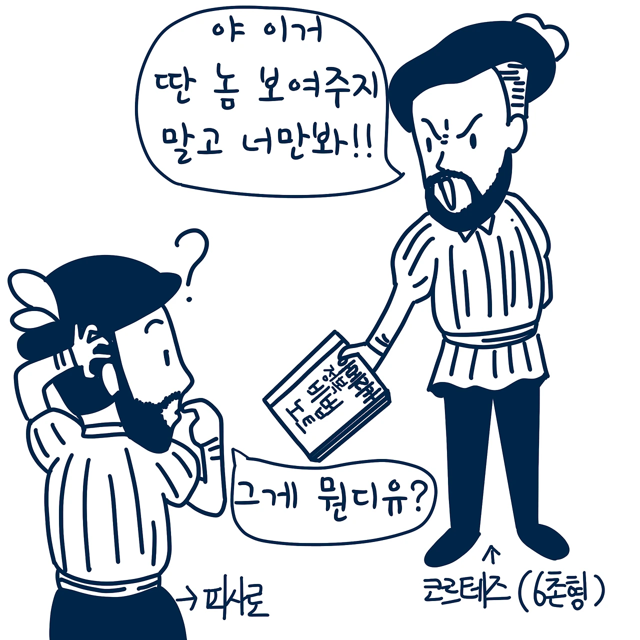 이미 글을 사용하고 있었던 스페인에서는 글로 남긴 경험이 정보가 되었고 이를 활용한 피사로는 그들은 총도 없고 칼도 없으며 게다가 신처럼 모시던 왕을 잡으면 아무리 많은 인구의 제국도 쉽게 정복할 수 있다는 것을 알 수 있었던 거야. 그에 비해 잉카제국은 아즈텍 왕국의 패망과 스페인 군대에 대한 정보가 전혀 없었지. 즉 총, 균, 쇠에 더해 문자가 유럽이 쉽게 아메리카를 정복할 수 있게 한 거지
