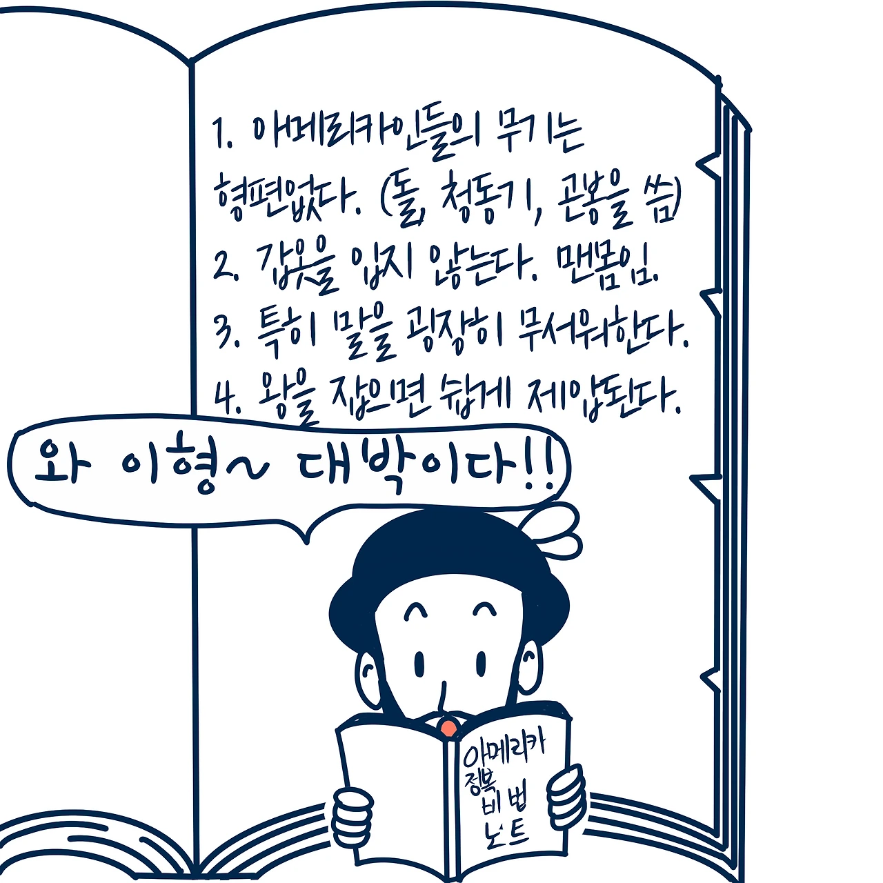 잉카 사람들이 보기에 스페인 군대는 우리가 아이언맨을 실제 보는 느낌이었을 거야~ 한마디로 충격과 공포로 가득했다는 거지. 심지어 스페인 군대가 타고 있던 말도 처음 보는 동물이었다는 거야.