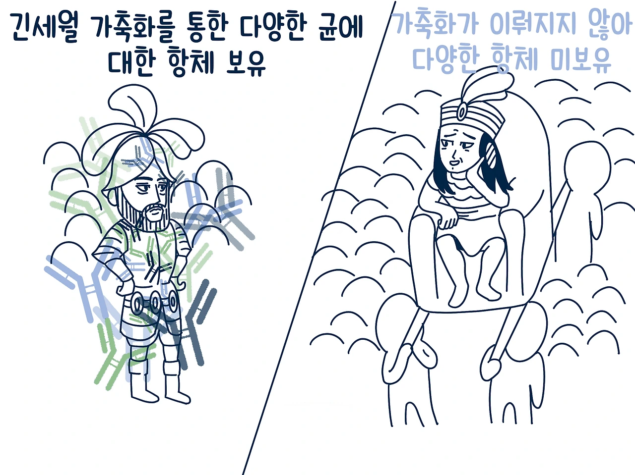 그렇게 수차례 전염병에 걸리고 죽음을 반복하면서 다양한 질병에 대한 항체를 형성하게 된 거야. 그런데 아메리카인들은 가축을 거의 기르지도 않았고 그만큼 다양한 병원균에 대한 항체가 없었던 거지.