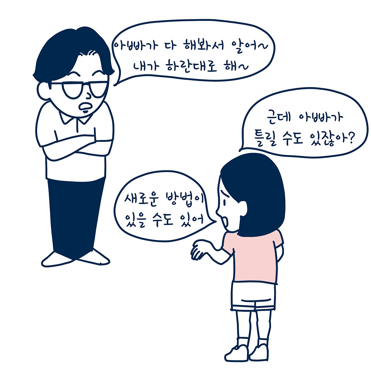 만약에 아빠가 알고 있는 것이 세상의 전부고 세상에는 더 공부할 게 없다고 해봐. 지금 우리딸은 아빠보다 더 많은 걸 알 필요가 있을까? 그저 아빠한테 물어보면 되는 거잖아. 그리고 결국에는 아빠보다 더 발전할 수 있을까? 없겠지.