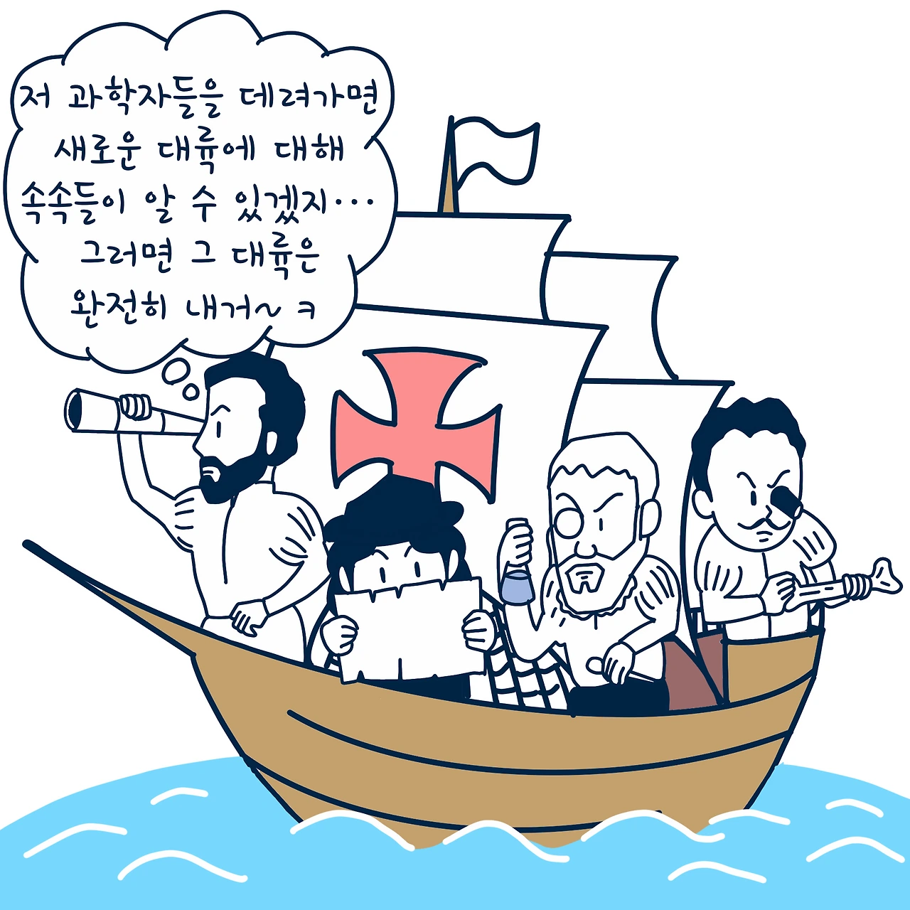 그렇게 새로운 대륙에 도착한 과학자들이 그 대륙에 대해서 속속들이 공부하게 되었고 공부로 알게 된 다양한 정보들은 대륙을 쉽게 정복하는데 도움을 주게 된 거야. 이때부터 서양에서는 과학에 투자를 하면 많은 이익을 얻을 수 있다는 믿음이 자리 잡게 되었지.