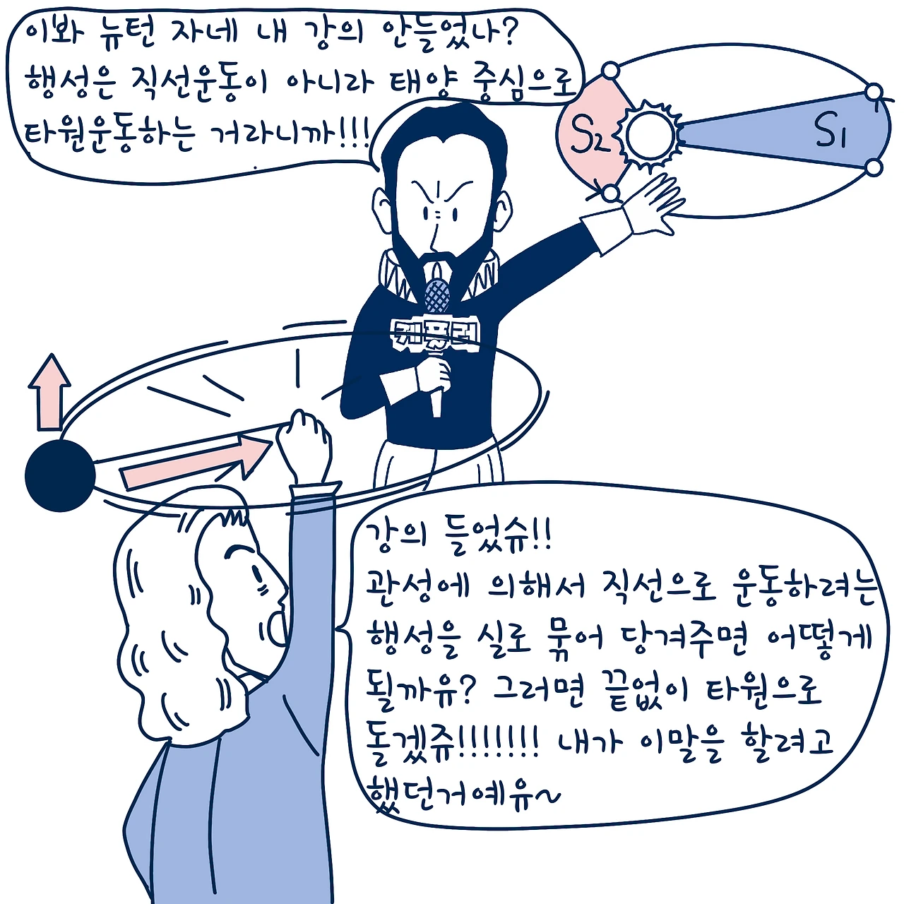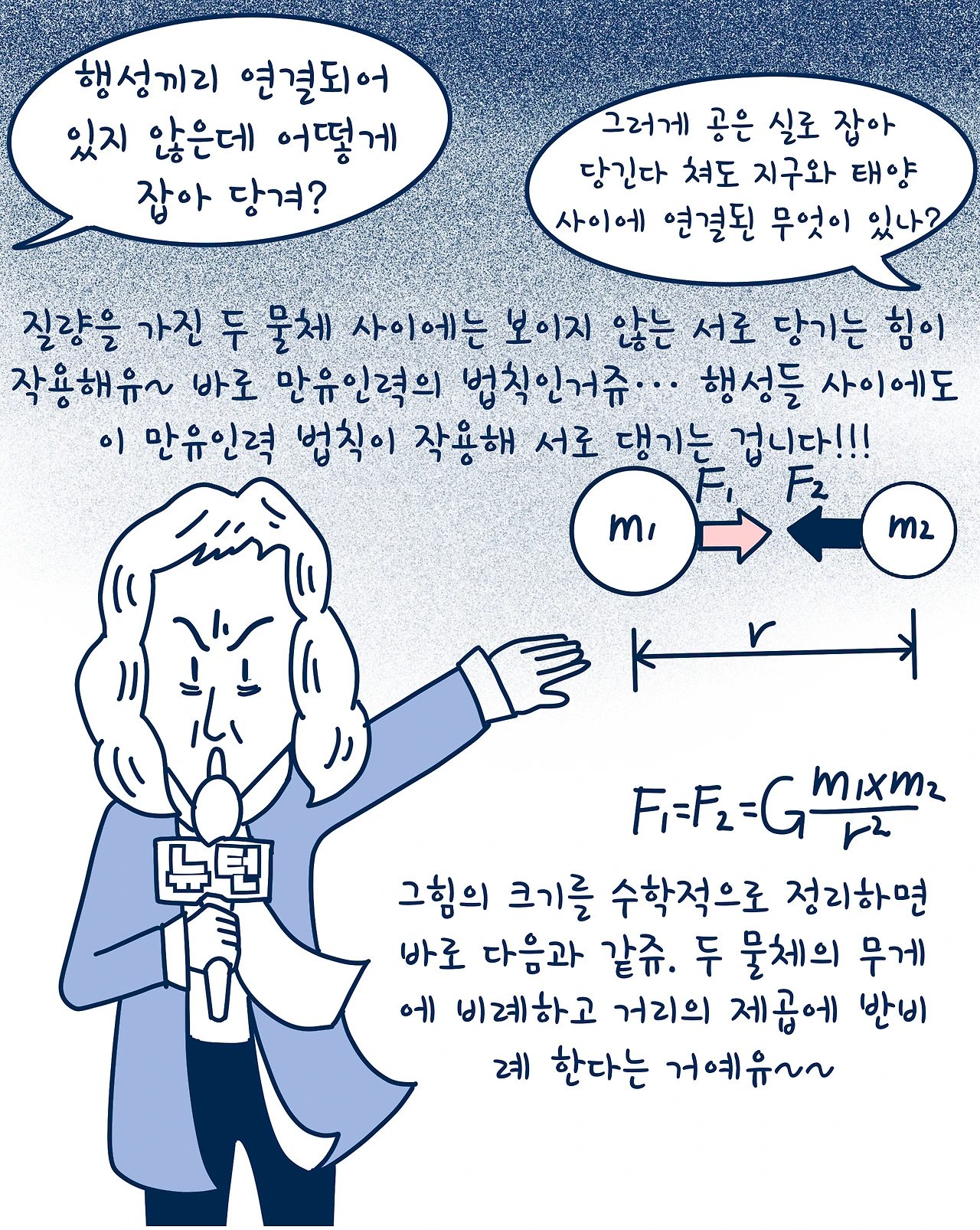 뉴턴은 직선 운동하는 행성들이 서로 끌어당겨서 계속 돌게 된다고 주장했어. 그런데 행성들 사이가 연결 되지 않았는데 어떤 힘이 작용하느냐는 의문점이 생겼고 이에 뉴턴은 모든 물체 간에는 보이지 않는 힘이 서로 작용한다고 이야기해~ 바로 만유인력의 법칙을 발견한 거야.