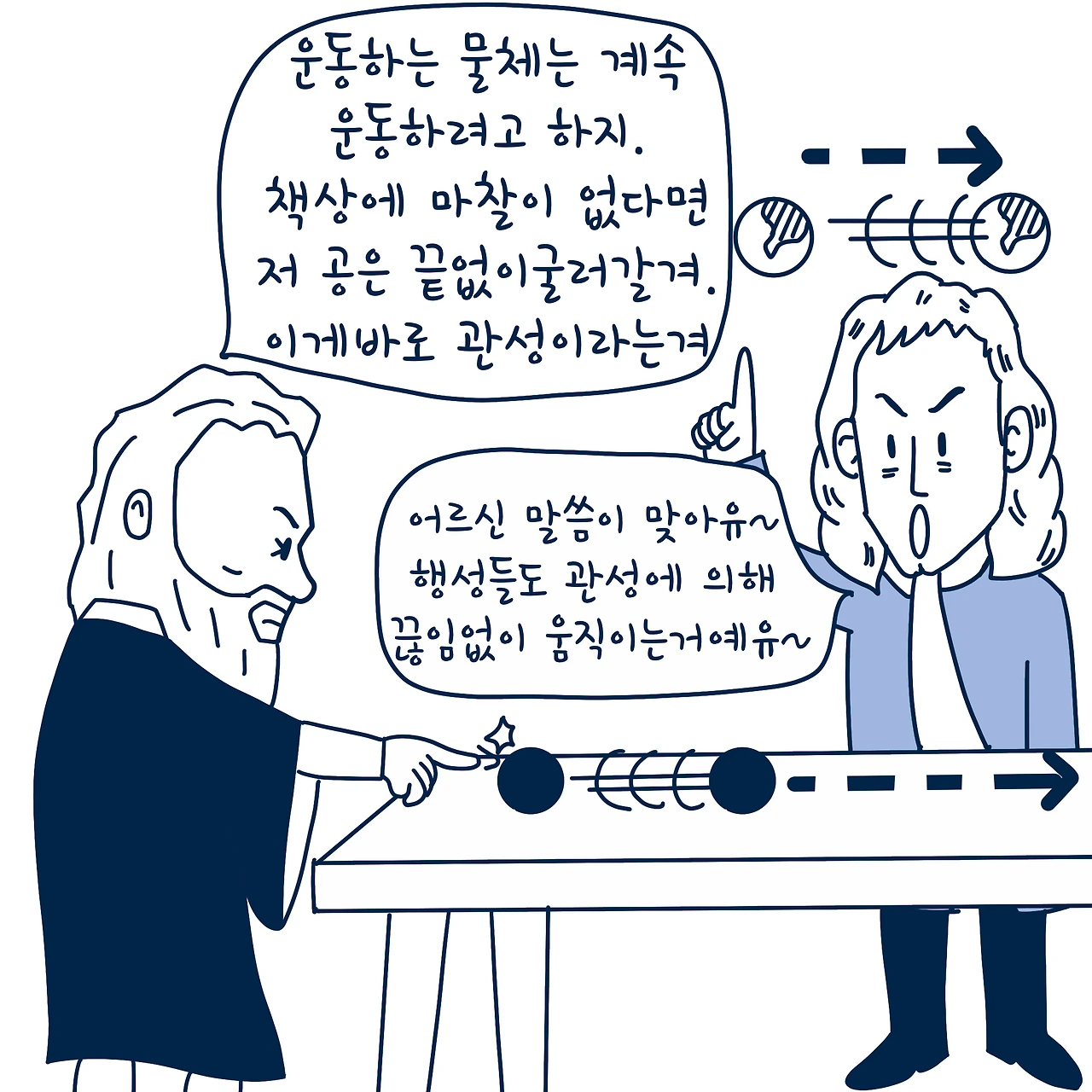 망원경으로 여러 행성을 관측했던 갈릴레오 갈릴레이는 관성의 개념을 발견했어. 정지한 물체는 정지해 있으려고 하고 움직이는 물체는 계속 운동하려고 한다는 개념을 이야기한 거지. 뉴턴은 행성들도 관성의 법칙에 의해 끊임없이 직선 운동을 한다고 생각했어.