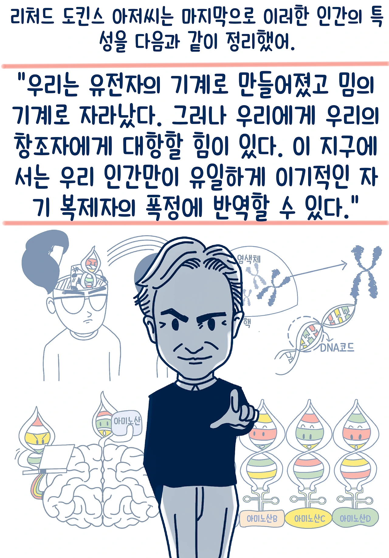 7. 아빠 말대로라면 피가 섞인 가족과 친척끼리만 이타적으로 행동한다고 하는데, 나와 아무런 관련 없는 사람을 위해 희생하고 봉사하는 사람들은 뭐야?