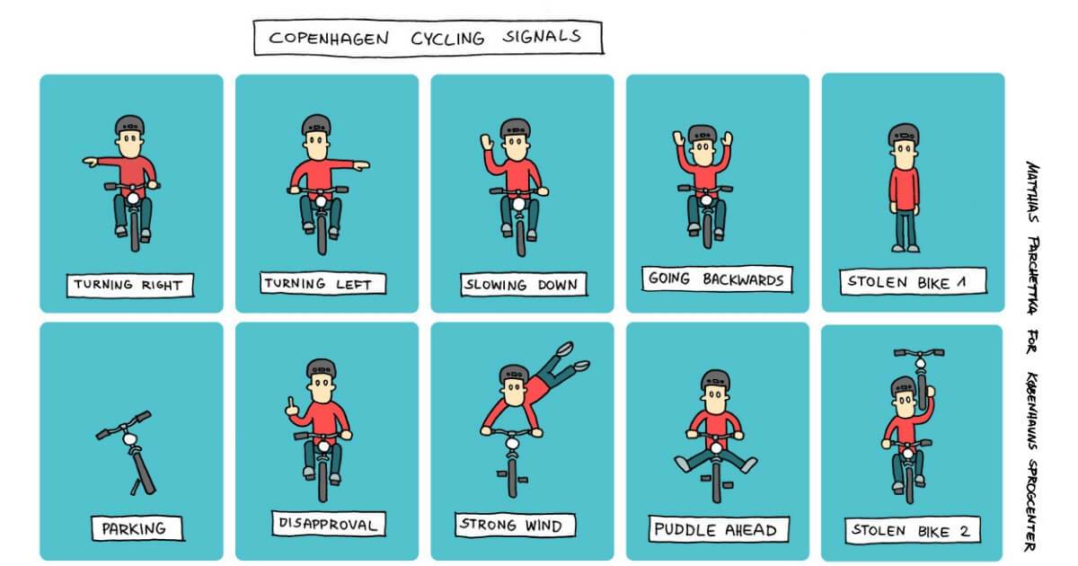 우회전 시에는 횡단보도를 건너는 사람이 없는지 확인 후 오른쪽 손으로 표시하면서 우회전해야 하며, 좌회전 시에도 똑같이 왼손을 뻗어 표시한다. 멈출 때도 표시를 해야 하는데 관광객들이 흔히 하는 실수가 아무 예고 없이 멈추는 것이다. 이럴 경우 뒤에서 속도를 줄이지 못한 다른 사람들에게 다중 충돌의 위험이 있으므로 꼭 신호를 주어야만 한다. 자전거를 타다가 멈추고 싶은 경우에는 한 손을 어깨 높이만큼 올려 뒷사람에게 신호를 준 뒤 천천히 속도를 줄이면 된다.