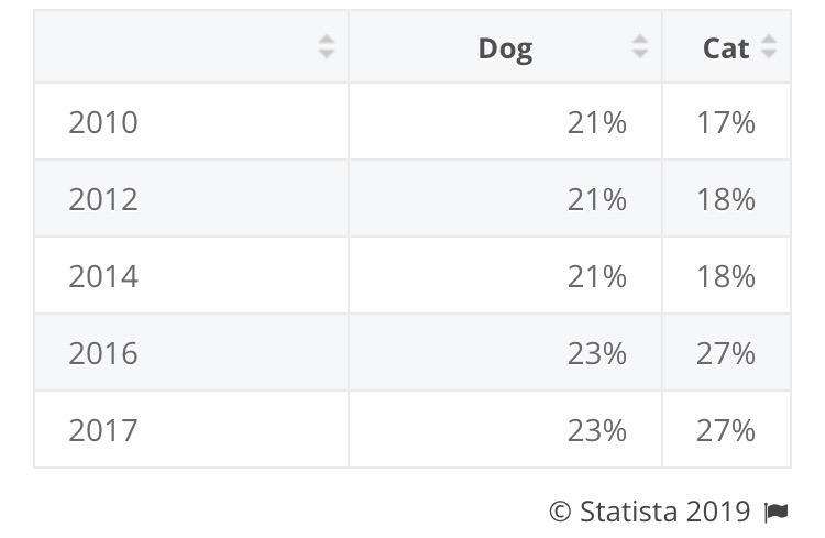 표를 통해 확인해보면 최근 고양이를 키우는 가정의 숫자가 증가하는 추세며, 따라서 덴마크에서는 '고양이'를 조금 더 많이 키운다는 것을 확인해볼 수 있다. (Denmark: households owning cats and dogs 2010-2017 | Statistic)