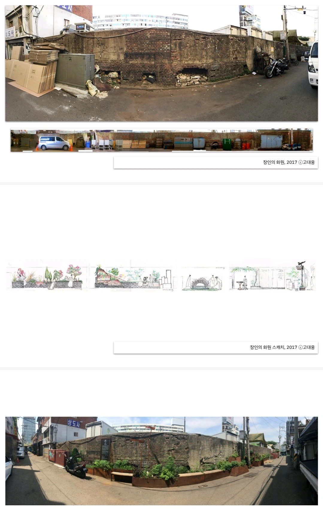 공간 예술은 마당을 넘어 거리로 확장되었다. 폐자재가 쌓이고 길고양이들의 오줌 냄새가 가득하던 담벼락을 ‘장인의 화원’으로 바꾸기 시작한다. 커다란 화분이 놓이고 뿌리를 뻗을 공간이 생겨서였을까. 몇 년간 꽃이 피지 않던 라일락은 다음 해에 다시 꽃을 피우기 시작했고 아무도 심지 않았지만 포도나무가 자라 열매를 맺기도 했다. 그렇게 라일락과 포도나무와 코스모스의 이야기가 거리에 모였다. 고양이도 함께.