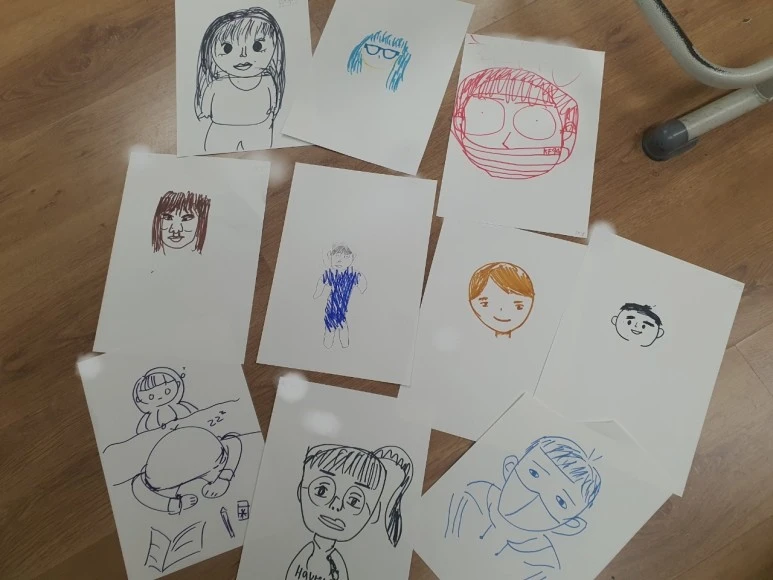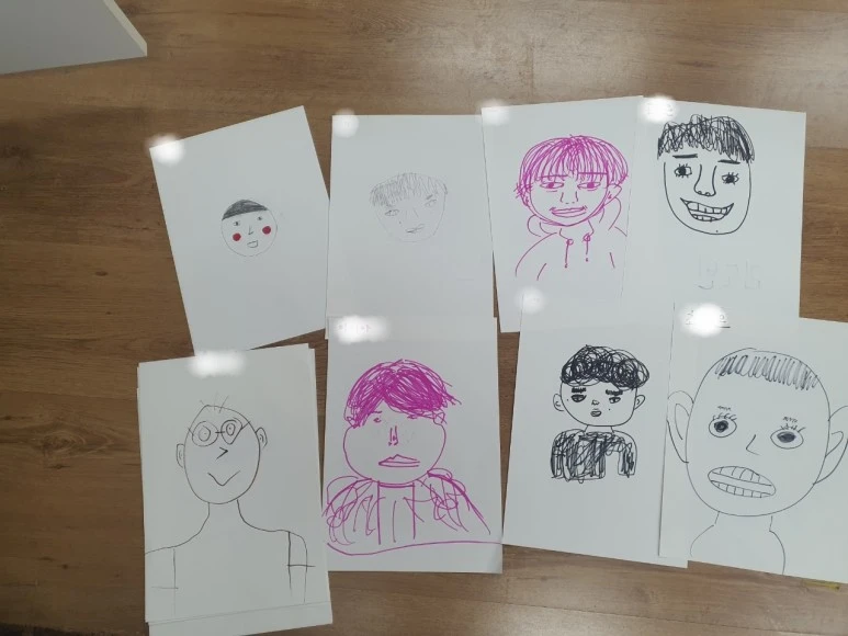 자기 소개 후, 2분 동안 친구 얼굴을 그리고 맞추어보는 활동을 했다. 2분이라는 시간은 굉장히 짧아서 당연하게도 못생기게 그려질 수 밖에 없음을 강조, 또 강조한 뒤에 시작했다. 친구의 특징을 빠르게 살펴보고 함께 웃고 즐기는데 목적이 있음을 여러차례 강조해야 엉뚱하게 상처받는 일이 없어진다. 쉽고 빠르고 간단한 미술 활동이지만 반응은 정말 좋은 학기초 활동이다.