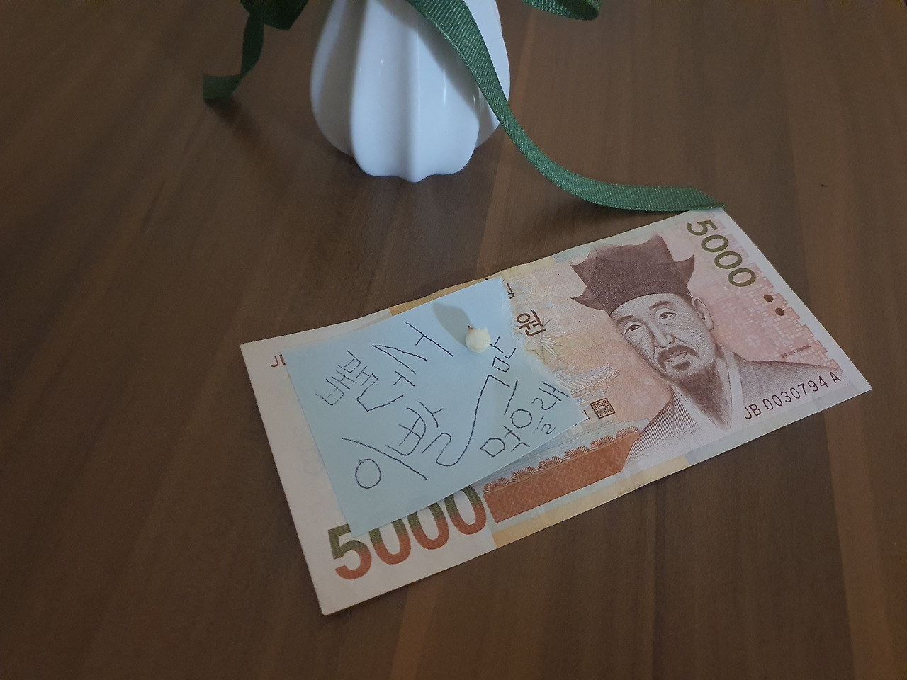 아이는 일어나자마자 눈을 비비며 식탁으로 다가간다. 그러고는 씨익 웃으며 덩실덩실 오천 원'만' 챙긴다.