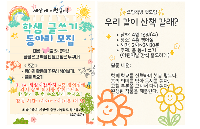 5, 6학년 복도에 동아리 모집 포스터를 붙였고 7명의 친구들이 참여하겠다고 찾아왔다. ‘뜻이 있는 곳에 길이 있다’는 말처럼 교장선생님께 활동 계획서와 취지를 설명하고 길을 만들었다. (특화 교육과정 예산을 조금 따올 수 있었다. )