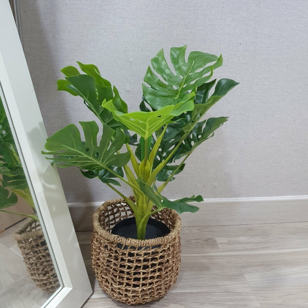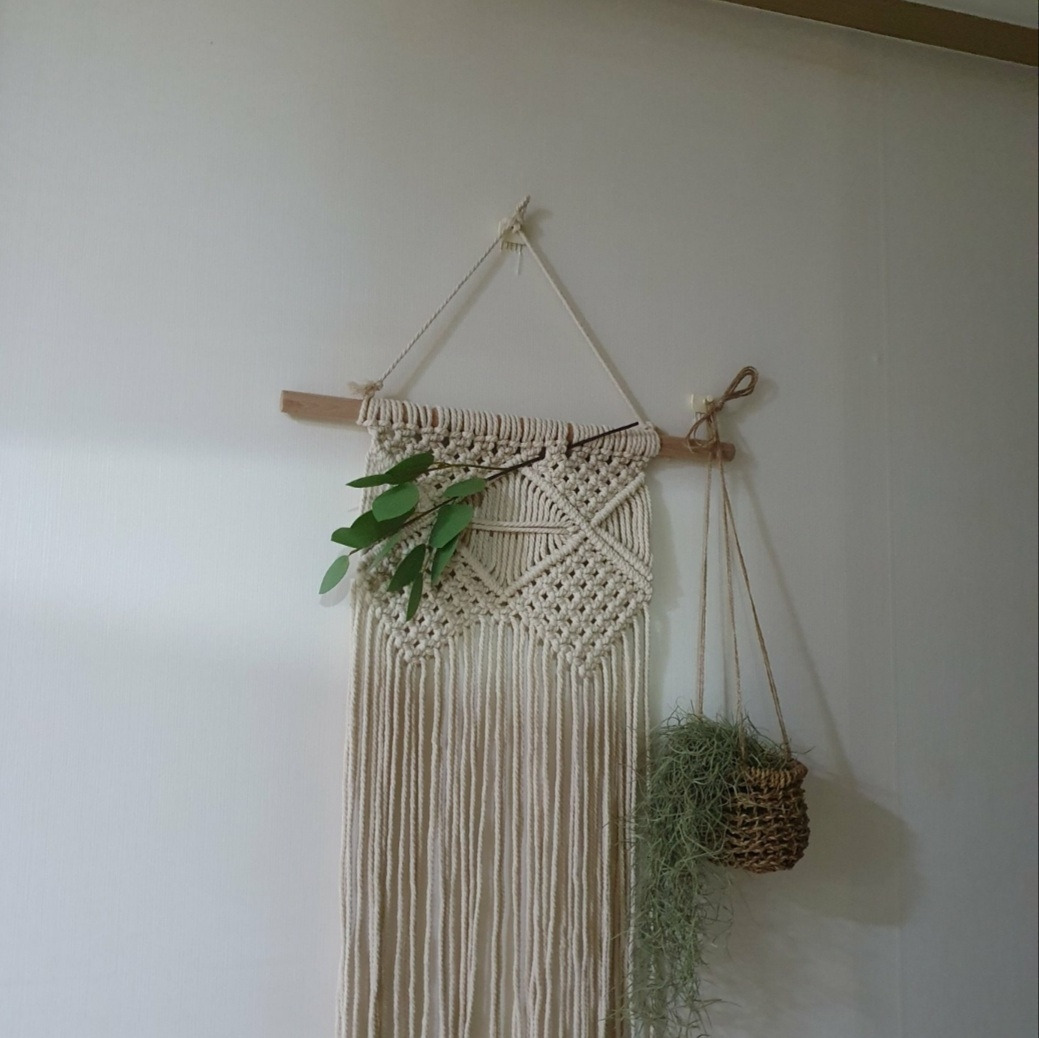 생화를 구매할까 고민하다가 관리 측면을 고려하여 결국엔 조화로 구매. 구매하고 보니 나름 꽤나 살아있는 것 같아 만족스러웠다. 현관 입구 쪽에 마크라메와 행잉 플랜트도걸어주니 더욱 분위기 있다.