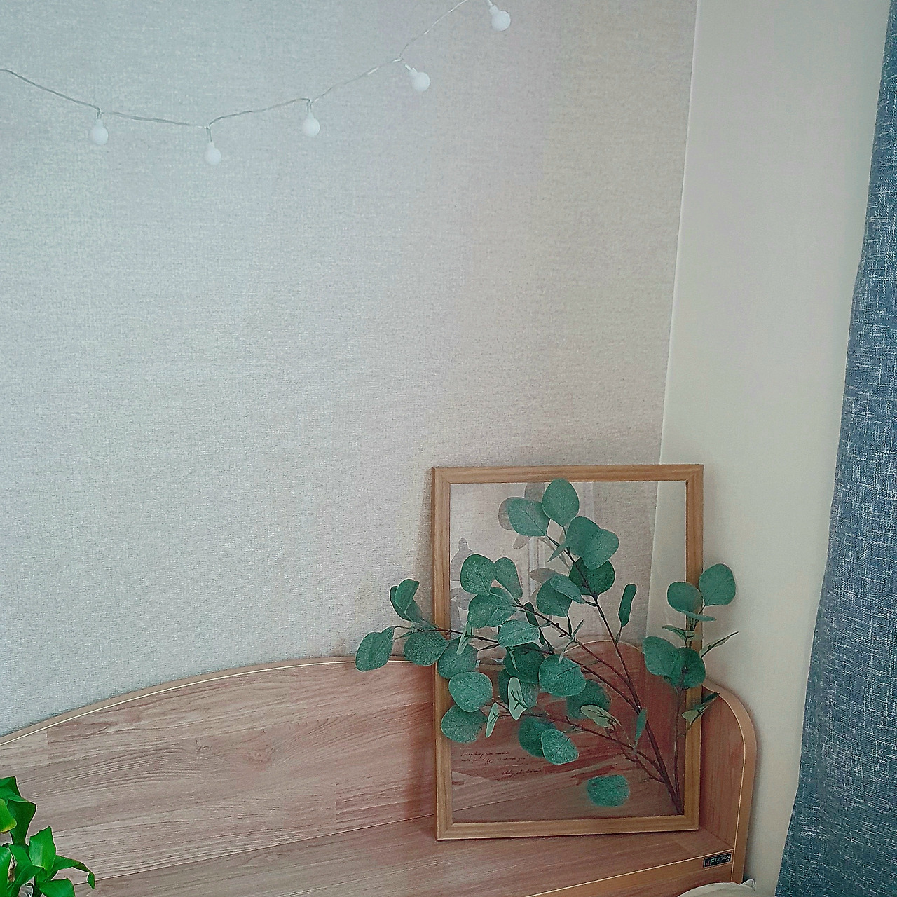 침대맡에는 나뭇가지 액자가 놓여있다. 액자 하나만 둬도 심심해 보이지 않도록, 나뭇가지가 입체로 튀어나와 있는 예쁜 액자.