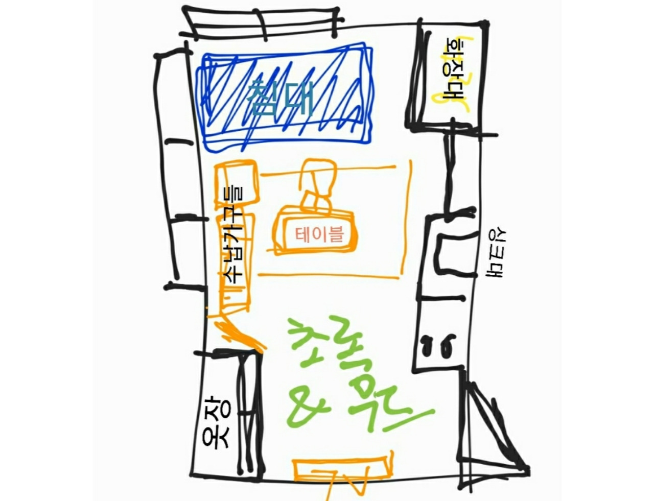 먼저 개략적인 방 도면을 그려보고, 이후불필요한 기존 가구들을정리한 후 새로운 가구들을주문하고, 마지막으로 인테리어의 완성을 위한 소소한 소품류들을 구매하는 것으로 계획을 세웠고곧바로 실행에 착수했다.