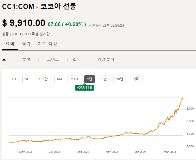 코코아 가격이 미친 듯이 오르고 있다. 1년 만에 +240%를 기록하며, 다른 자산들을 비웃듯이(테슬라...?) 계속 상승하고 있다. 2023년 초에 시작된 코코아의 상승세는 멈출 기미가 보이지 않는다. 톤당 9,000달러 수준을 넘어서면서, 역사적인 고점을 갱신했다.