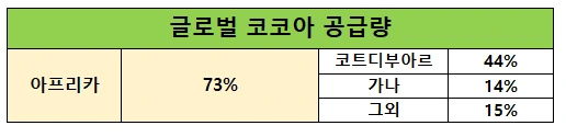 전 세계 코코아의 73%가 아프리카에서 생산되며, 특히 서아프리카가 대부분의 공급을 책임지고 있다. 코트디부아르와 가나가 각각 44%, 14%를 점유하고 있다. 2024년 2월 두 나라 모두 전년보다 수확량이 35%나 급감했다.