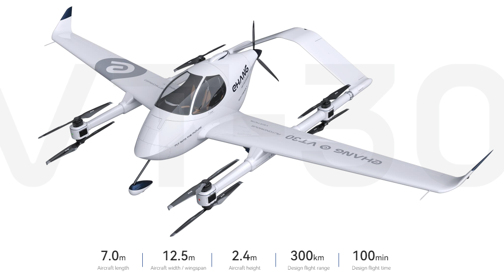 VT-30 모델은 EH216-S 모델보다 크기가 크고 최대 300km까지 갈 수 있는 장거리용 드론택시다. 현재 개발 단계에 있다고 한다.