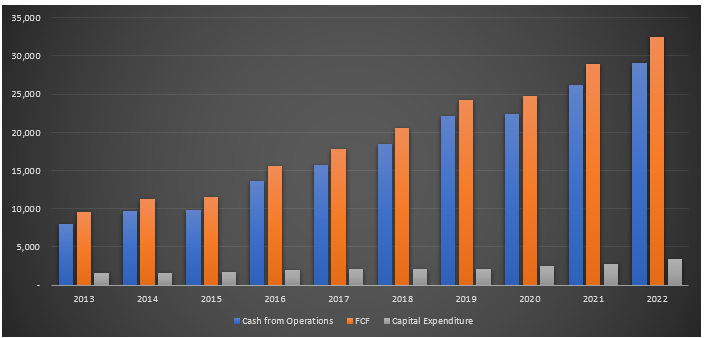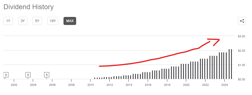 꾸준하게 배당을 늘려왔으며, 배당성장률은 연평균 20%가 넘습니다.