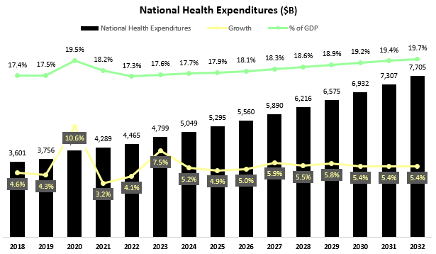 CMS 데이터에 따르면, 미국 의료 지출은 향후 10년간 연평균 5.6%씩 성장할 것으로 예상됩니다.