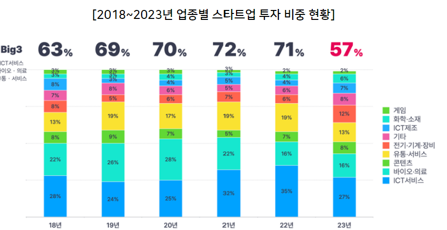 아래는 업종별 스타트업 투자 현황입니다. BIG 3인 ICT/바이오/통신서비스의 비중이 2023년 급감하는 모습을 볼 수 있습니다. 점차 투자처가 다각화되는 모습입니다.