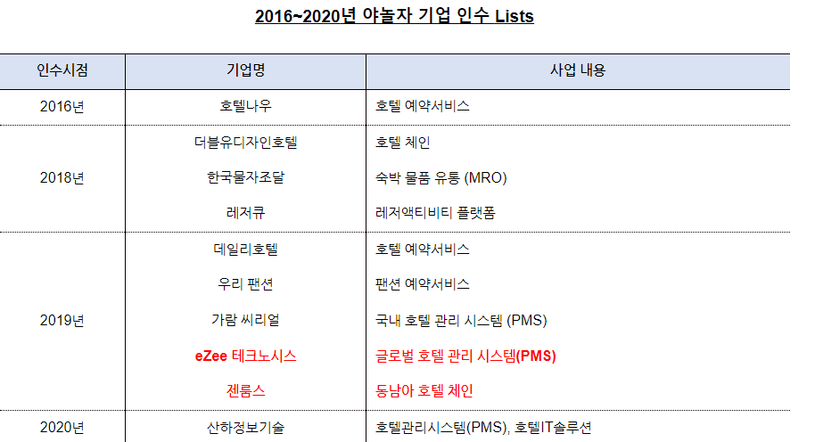 실제로 야놀자는 다양한 인수를 진행하면서 PMS시장에 빠르게 진입하는 동시에 숙박 관련해서 모든 것을 수직계열화 하고 있습니다.