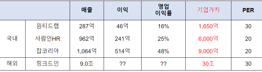 원티드랩은 PER 30배를 적용받고 있습니다. 우리에게 친숙한 사람인과 잡코리아는 PER 20배입니다.