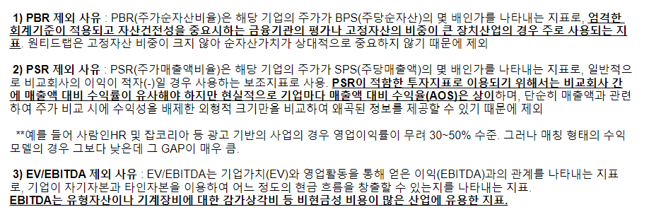 기업이 공모를 할 때 자신들이 기준으로 삼지 않은 지표들이 왜 적합하지 않는지를 언급합니다. 이러한 부분들을 유심히 본다면, 업종별로 적용되는 지표들을 습득할 수 있으며, 시장관점에서 기업가치를 바라볼 수 있습니다.