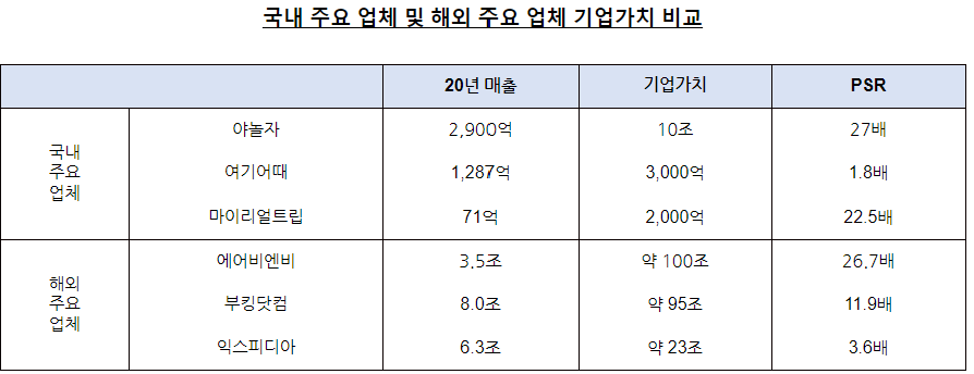 야놀자는 자신들이 일반 숙박 플랫폼과는 다르며, 글로벌 선두주자인 에어비엔비와 비슷하다는 논리로 가치평가를 하고 있습니다.
