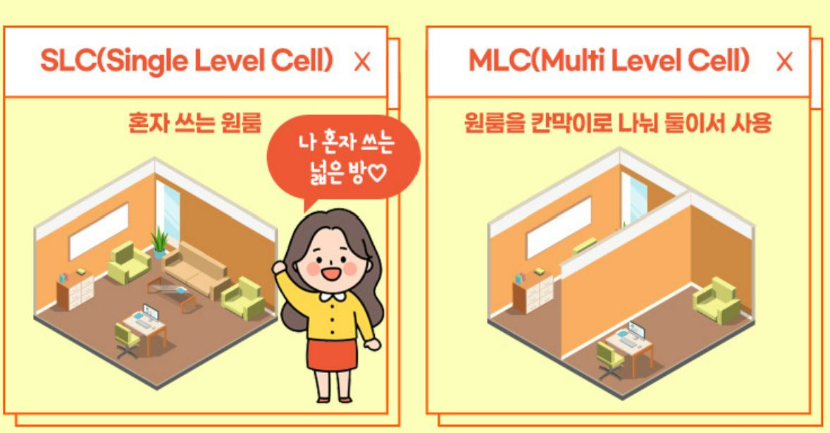 즉, SLC 하나의 방에 한 명의 사람이 살고 있는 것이 됩니다. 원룸에 혼자 살기에 가격은 비싸지만 삶의 질(=데이터 처리 속도)은 좋습니다.