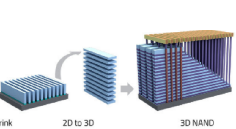 2D 구조: 셀이 평면 구조로 배열된 구조입니다. 초기 낸드 플래시 구조로, 용량 확장이 어려운 단점이 있습니다.