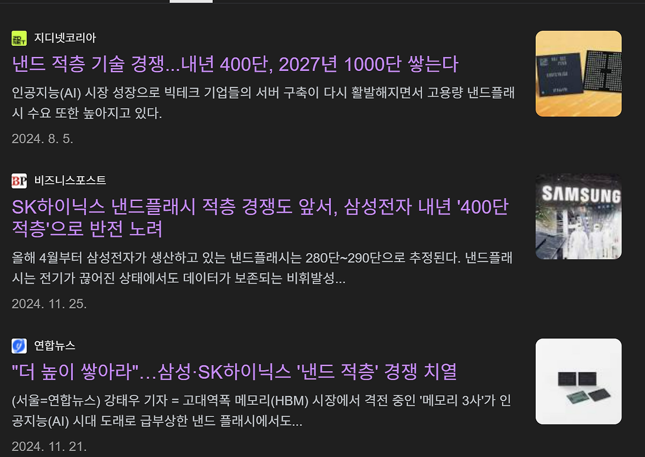 321층(2024년): SK하이닉스가 321층 낸드플래시 양산에 성공했다고 밝히며, 2025년부터 고객사에 공급하겠다고 밝혔습니다.