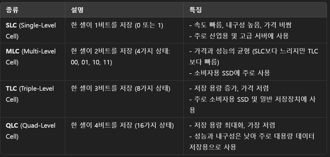 QLC(Quad-Level Cell): 하나의 메모리 셀이 4비트를 저장함