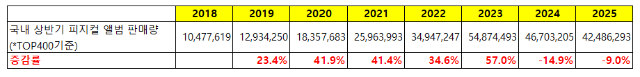 글로벌 스트리밍 시장은 24년 상반기 대비 +10.3% 성장했지만, 앨범 판매량은 -6.0% 감소했습니다. 국내 피지컬 앨범 판매량은 -9% 감소했습니다. 국내 피지컬 앨범도 -9% 감소하면서, 2018~2023년까지 이어오던 성장세가 둔화되기 시작했습니다.