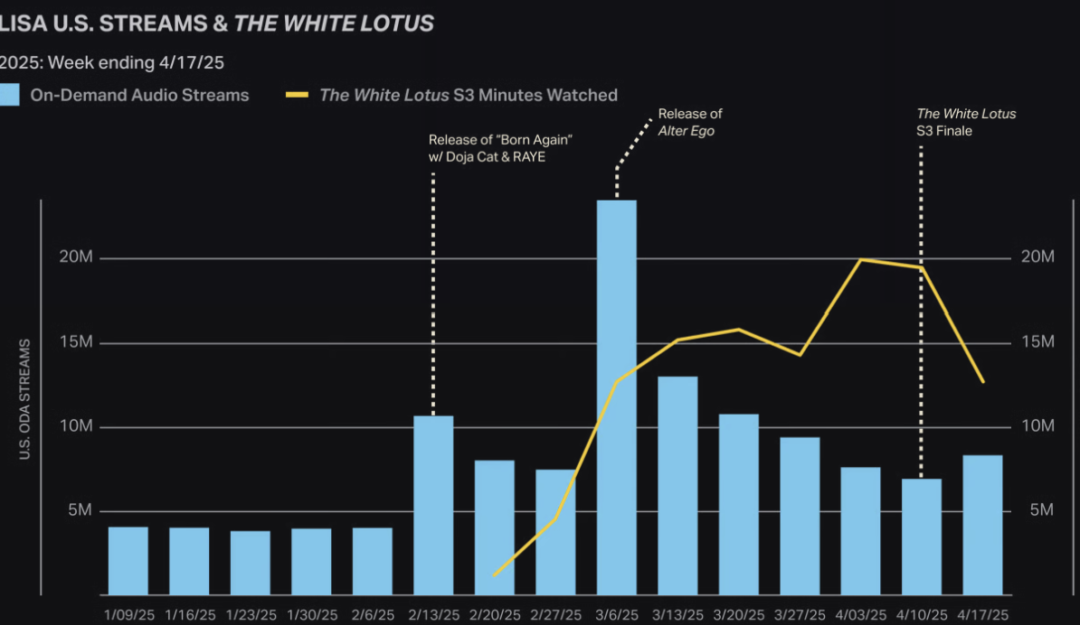 최근 블랙핑크 리사의 활동을 보면, 이러한 슈퍼팬 비즈니스가 방송, 숙박 등 다양한 산업과 크로스 프로모션에 효과적인 것 같습니다. 리사의 싱글 발표 시점에 따라서 화이트 로투스 3 방송 시청률이 급등하며, 약 3주간 평균 18~20M을 유지했습니다. 유명 아티스트의 활동과 그를 사랑하는 슈퍼팬들의 기반으로 일정 부분 공동 마케팅 효과가 가능하다는 것을 느꼈습니다. 또한 일반 소비자 대비 리사 팬들은 크루자 예약 가능성이 2배, 숙박 예약 가능성은 112%, 항공권 예약 가능성은 93% 더 높다고 합니다.