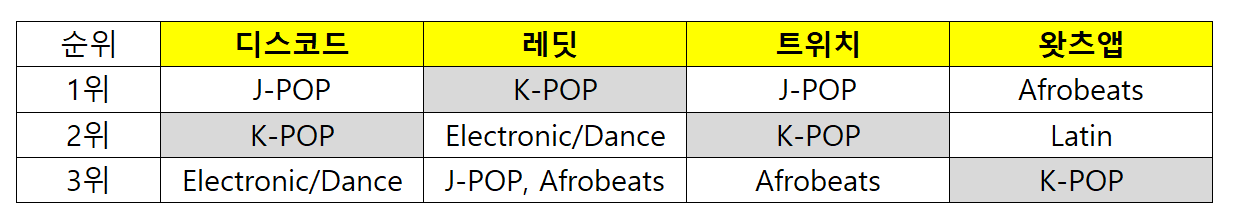 슈퍼팬들은 다양한 플랫폼 커뮤니티에서 활동하고 있습니다. 대표적인 플랫폼에서 어떤 장르 팬들이 Over-index 하고 있는지 확인할 수 있습니다. K-POP은 레딧에서 가장 활발하며, 유일하게 4개 커뮤니티에서 모두 TOP 3에 들었습니다. 커뮤니티별 핫한 장르를 확인함으로써 슈퍼팬 비즈니스를 하는 기업들은 홍보 타기팅을 더 효율적으로 할 수 있을 것 같습니다.