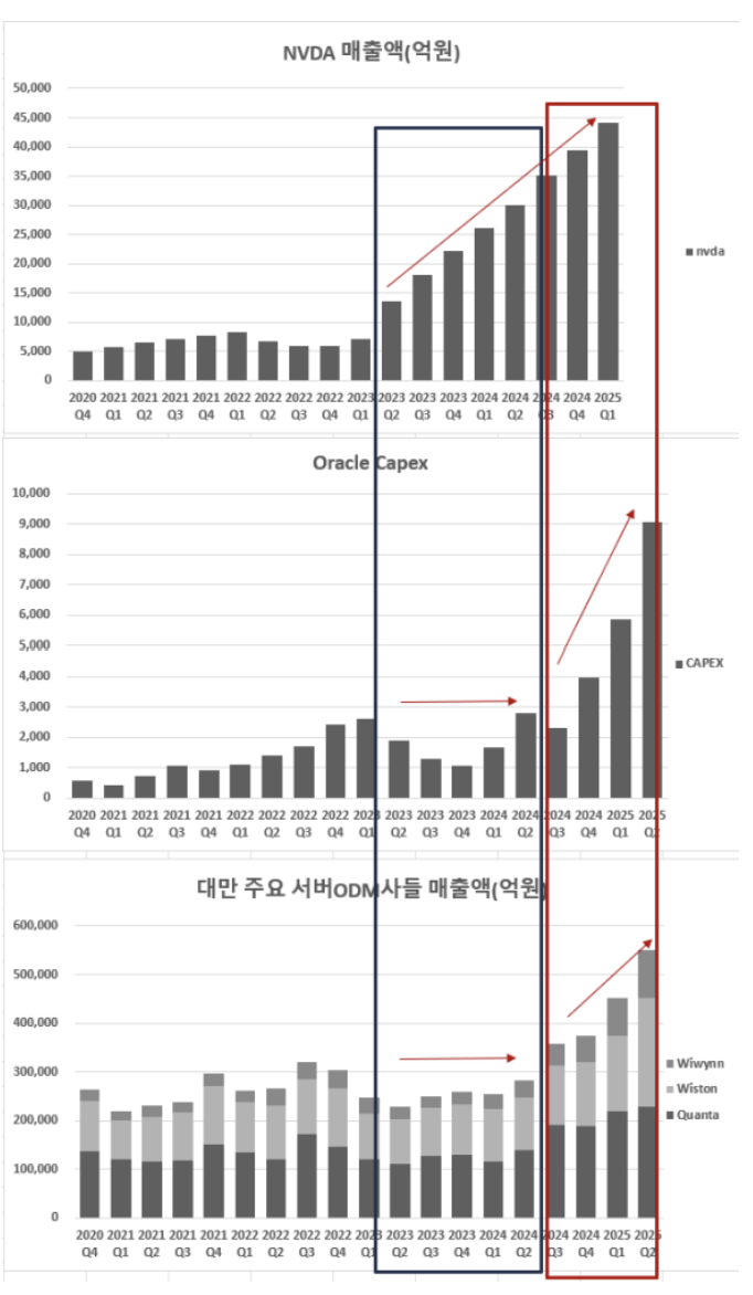 그런데 2024년 3분기부터 오라클과 대만 ODM 업체들이 빠르게 성장하는 모습입니다. 본격적으로 AI 수요가 전체적으로 확산되는 모습. 최근 오라클 어닝콜에서도 확인할 수 있습니다.