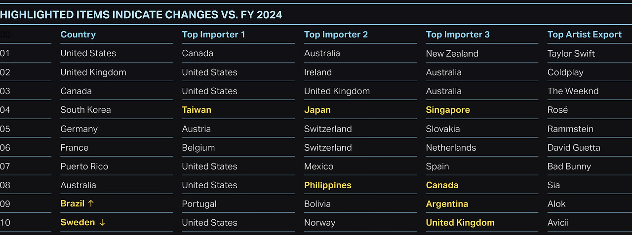 전 세계 음악시장에서 가장 큰 축을 차지하고 있는 영미권 지역(미국/영국/캐나다)을 제외하고 아시아 국가 중 유일하게 한국이 TOP 10에 랭크되었습니다. 주요 수입국 가는 대만, 일본, 싱가포르이며, 다른 TOP 10 국가들과는 다르게 모두 아시아 국가로 구성되어 있습니다. Top Arist로는 블랙핑크 로제가 뽑혔습니다. 지난번 글에서 K-POP은 K를 때야 성공할 수 있다는 것을 언급했습니다. 가장 대표적인 사례로 블랙핑크의 솔로 활동을 꼽았으며, 이번 상반기 보고서에도 해당 전략은 여전히 유효한 것으로 보입니다.