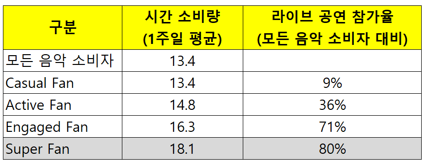 luminate가 23년 발표한 자료에는 미국 전체 소비자의 15% 였지만, 현재 18%로 증가했습니다. Super Fan은 1주일 평균 18.1시간을 음악 소비에 사용하며, 이는 일반 소비자 대비 +35% 높은 수치입니다. 특히 라이브 공연 참가율은 +80% 높습니다.