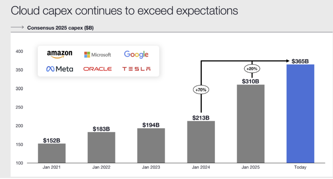 AI 수요가 다시 한번 강하게 상승하는 것 같습니다. Coatue 최근 보고서에 따르면, 현재 AI 투자를 가장 많이 하고 있는 6개사(아마존, 마이크로소프트, 구글, 메타, 오라클, 테슬라)가 25년 1월에 발표한 capex는 310억 달러(한화 약 400조)로 전년 동기 대비 70% 증가했습니다. 그리고 25년 5월 365억 달러로 증가시켰고, 단 4개월 만에 55억 달러(한화 약 40조 원)를 추가했습니다.
