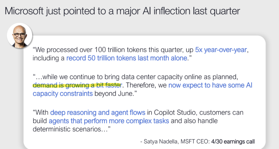 "이번 분기에 우리는 100조 개가 넘는 토큰을 처리했으며, 이는 전년 대비 5배 증가했습니다. 데이터 센터 용을 온라인으로 계속 전환하고 있지만, 수요는 계획보다 조금 더 빠르게 증가하고 있습니다. 6월 이후에는 AI 용량에 제약이 있을 것으로 예상합니다." - 마이크로소프트 CEO