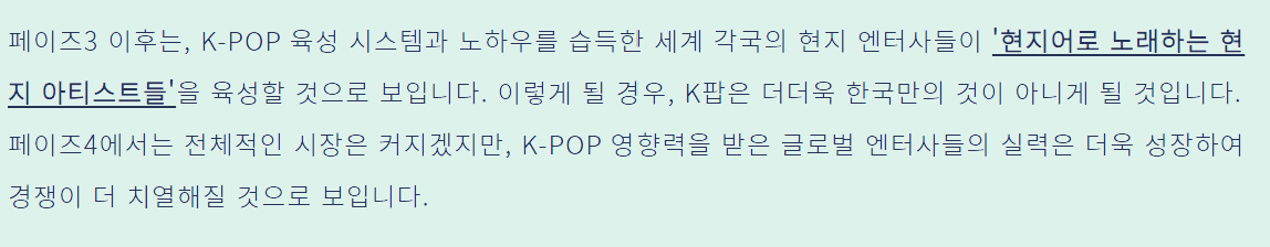 K-POP 시스템을 직접 구축하지 않아도, 해외 제작사와 플랫폼들은 K-POP 스타일의 문법을 차용해 현지 IP로 성공할 수 있습니다. 이렇게 된다면... K-POP과 한국의 상징성은 확산될 수 있지만, 경제적 이득은 한국이 아닌 다른 국가가 가져갈 수 있죠.