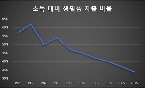 아래의 그래프는 인류가 생존에 필요한 소득이 얼마나 하락했는지를 보여줍니다. 우리는 '가처분 소득'이 정점이 시대를 살고 있죠. 더 이상 어렵게 번 돈을 남김없이 생필품에 쓸 필요가 없어졌으며, 값비싼 자동차와 옷, 크루즈 여행, 호화로운 데이트 비용, 은퇴비용 등 다른 곳에 쓸 수 있게 된 것입니다.