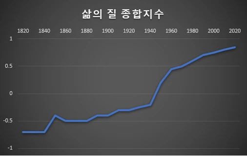 그리고 이러한 현상은 자연스럽게 인류의 '삶의 질'을 극적으로 증가시켰습니다. 우리 인간은 '욕구(생존) 단계'를 넘어서 보다 '실존적인 질문'들을 던질 여유가 생겼습니다. 하루하루 끼니 걱정, 집세 걱정보다 더 중요한 문제에 집중함으로써 더 행복해진 것입니다.