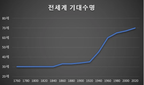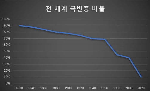 전 세계 사람들의 기대수명은 계속해서 증가 중입니다. 1920년 이전까지 평균 30세에 불가했지만, 현재는 70세까지 증가했습니다. 그리고 전 세계 '극빈층'비율도 빠르게 감소했습니다. 극빈층이란, 하루 2달러 이하로 생활하는 상태를 의미합니다.