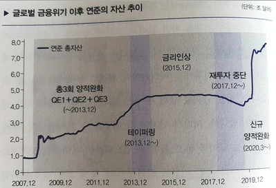 2007년 말 미국 금융위기를 시작으로 글로벌 금융위기가 왔다. 이것을 해결하기 위해 연준은 3차의 양적완화를 통해 2013년 말까지 자산을 매입했다.