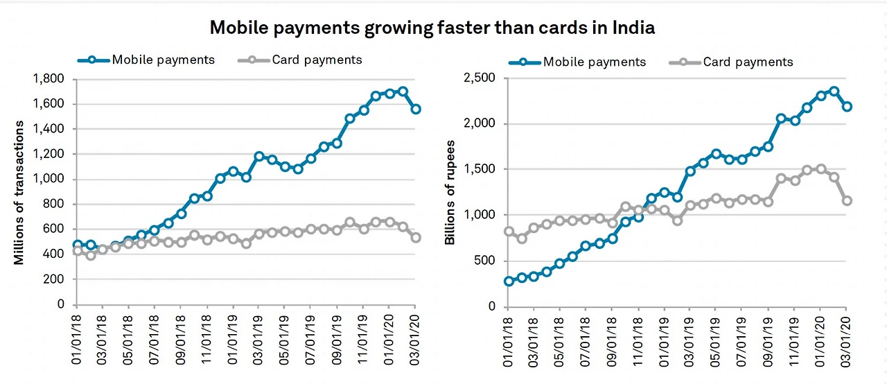 앞서서, 인도의 스마트폰 시장이 얼마나 빠르게 성장 중인지 확인했다. 이와 동시에 커지는 것이 모바일 결제 시장이다. 20년 3월을 기준으로 16억 건의 모바일 결제가 발생했다.