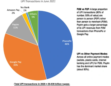 거래액은 2조 루피(약 35조 원)로, 2018년 11월을 기점으로 실물 카드 결제액을 넘어섰다. 인도의 모바일 결제 시장의 영향요인으로는 3가지로 볼 수 있다.